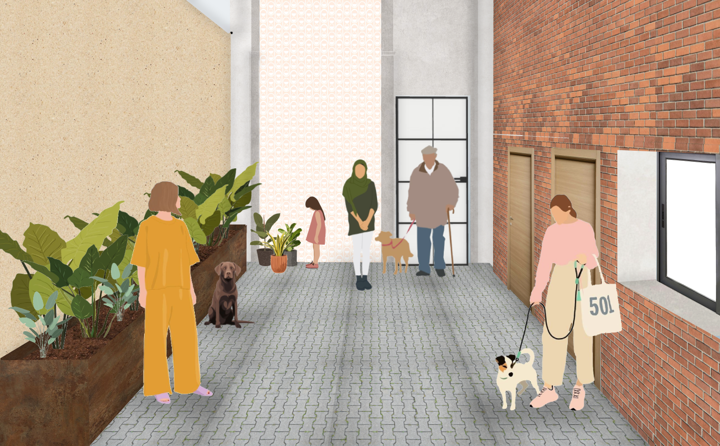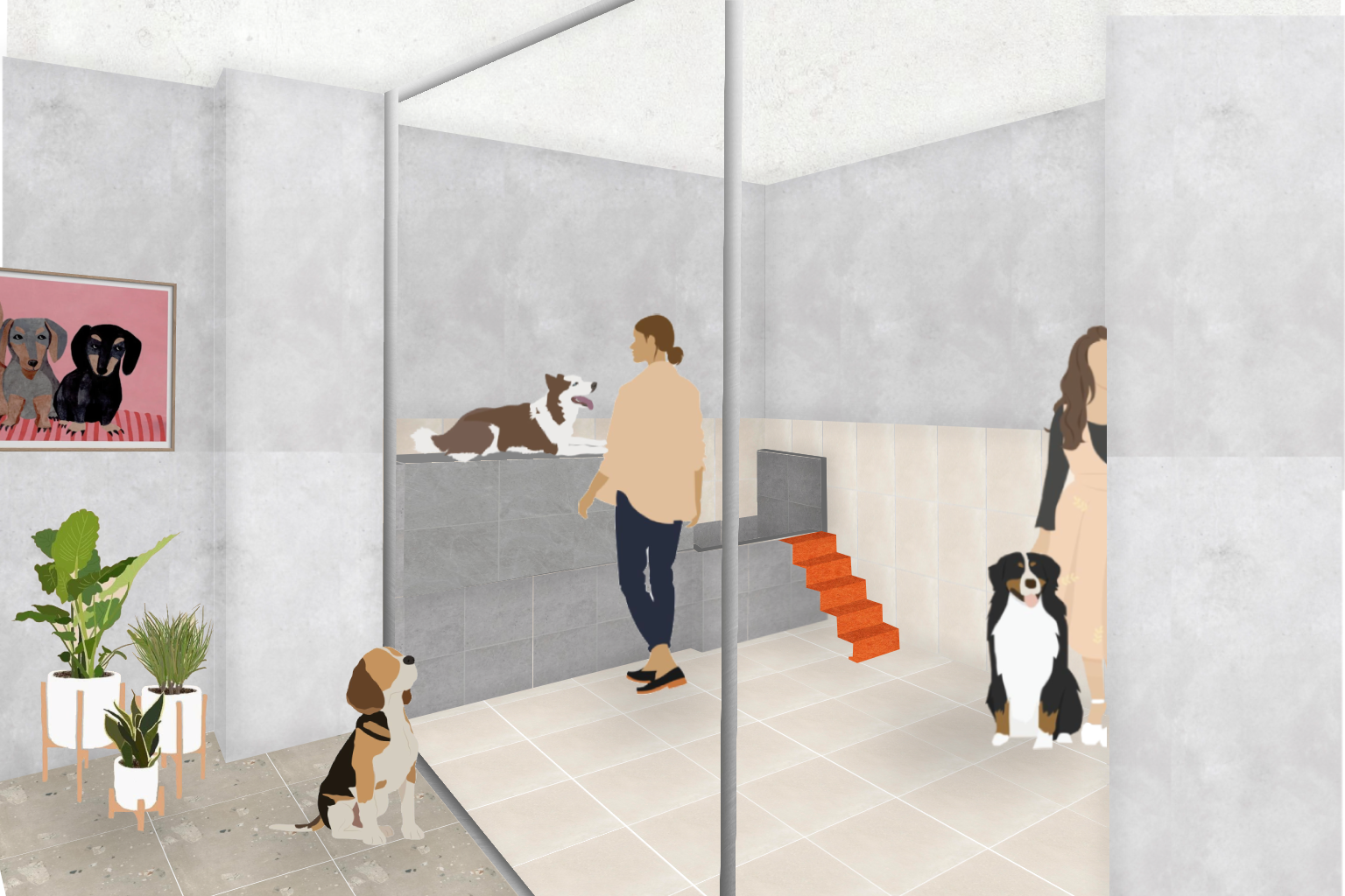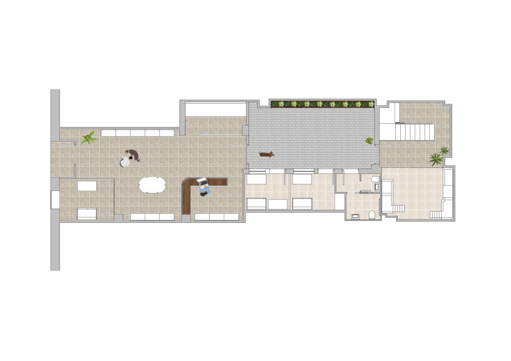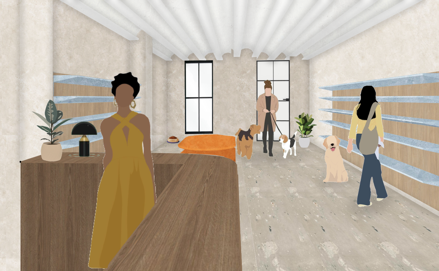 Se crea una peluquería dedicada al cuidado de nuestros pequeños amigos, los perros. Se cuenta con una zona de tienda con todo lo necesario, una guardería para que nuestros amiguitos esperen, una zona exterior para disfrutar de la naturaleza y la zona respectiva para los empleados.